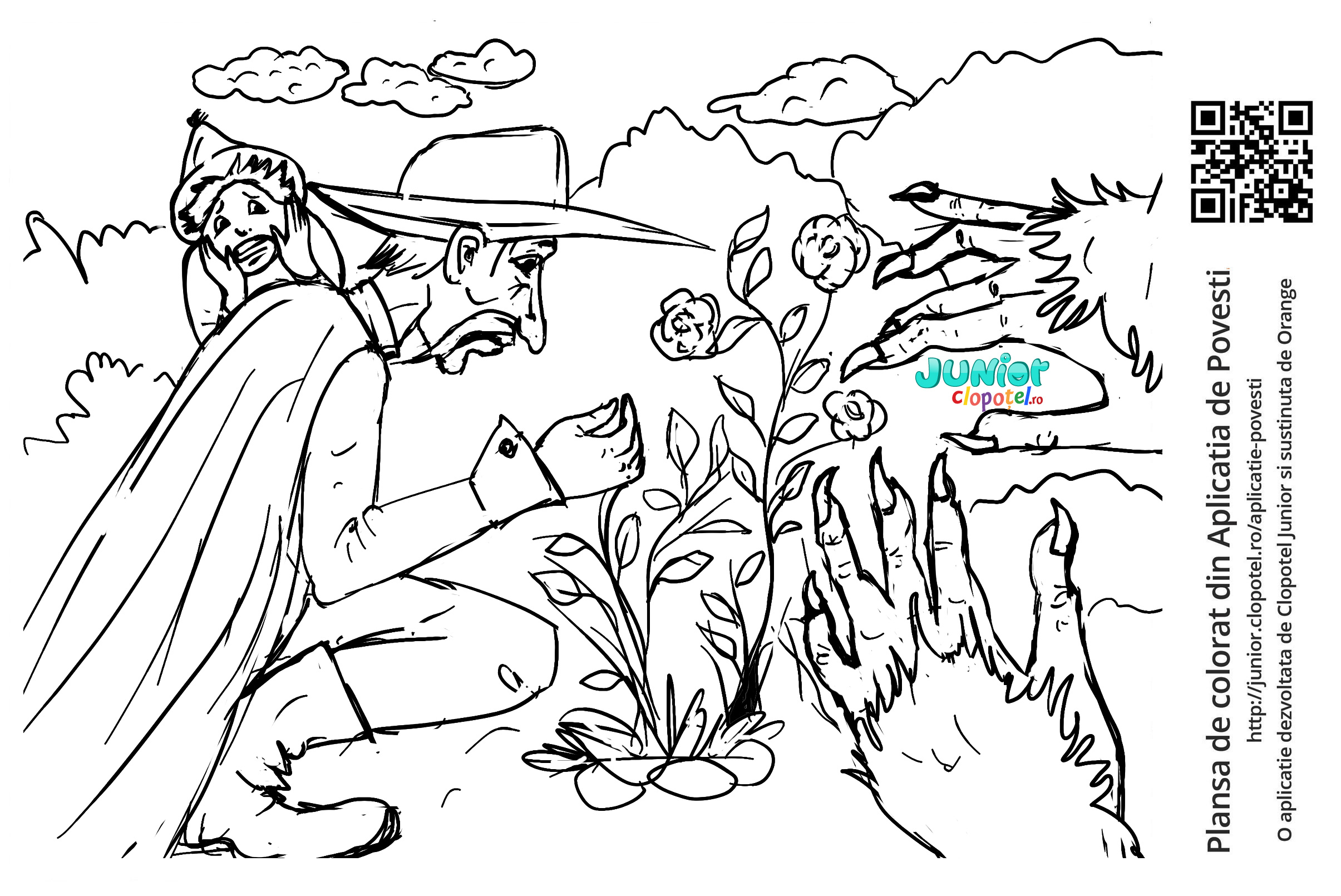 Descriere: Plansa de colorat cu negustorul care rupe trandafirul pentru fetita sa. Scena din "Frumoasa si bestia" din aplicatia POVESTI. Daca vrei sa descoperi mai multe basme sau legende, descarca-ti aplicatia din Google Play sau App Store.
