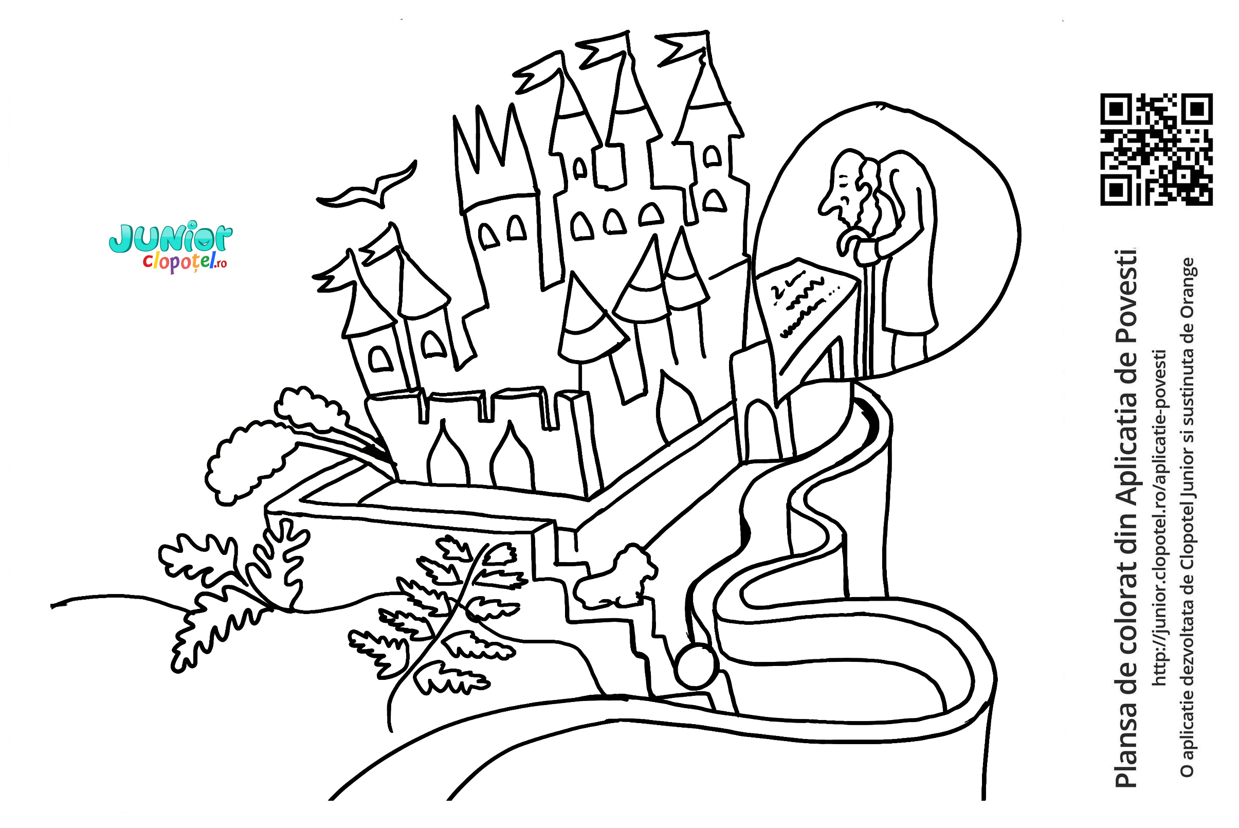 Descriere: Plansa de colorat cu un palat misterios. Scena din basmul "Regina Albinelor" din aplicatia POVESTI. Daca vrei sa descoperi mai multe basme sau legende, descarca-ti aplicatia din Google Play sau App Store.