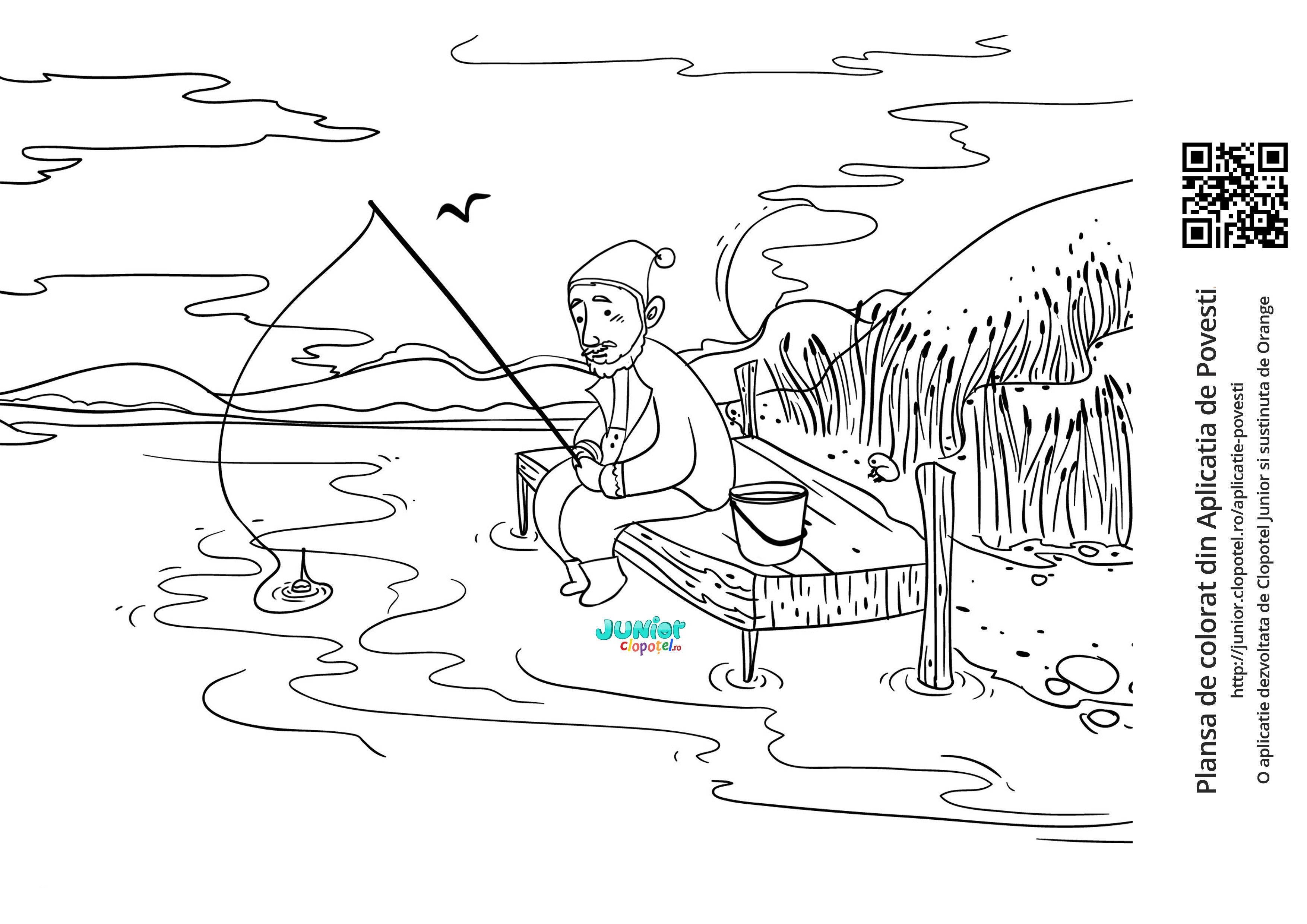 Descriere: Coloreaza plansa cu pescarul cel sarac care are acelesi probleme pe care le avea inainte sa prinda pestisorul de aur. Scena din povestea "Pestisorul de aur". Citeste sau asculta povestea.