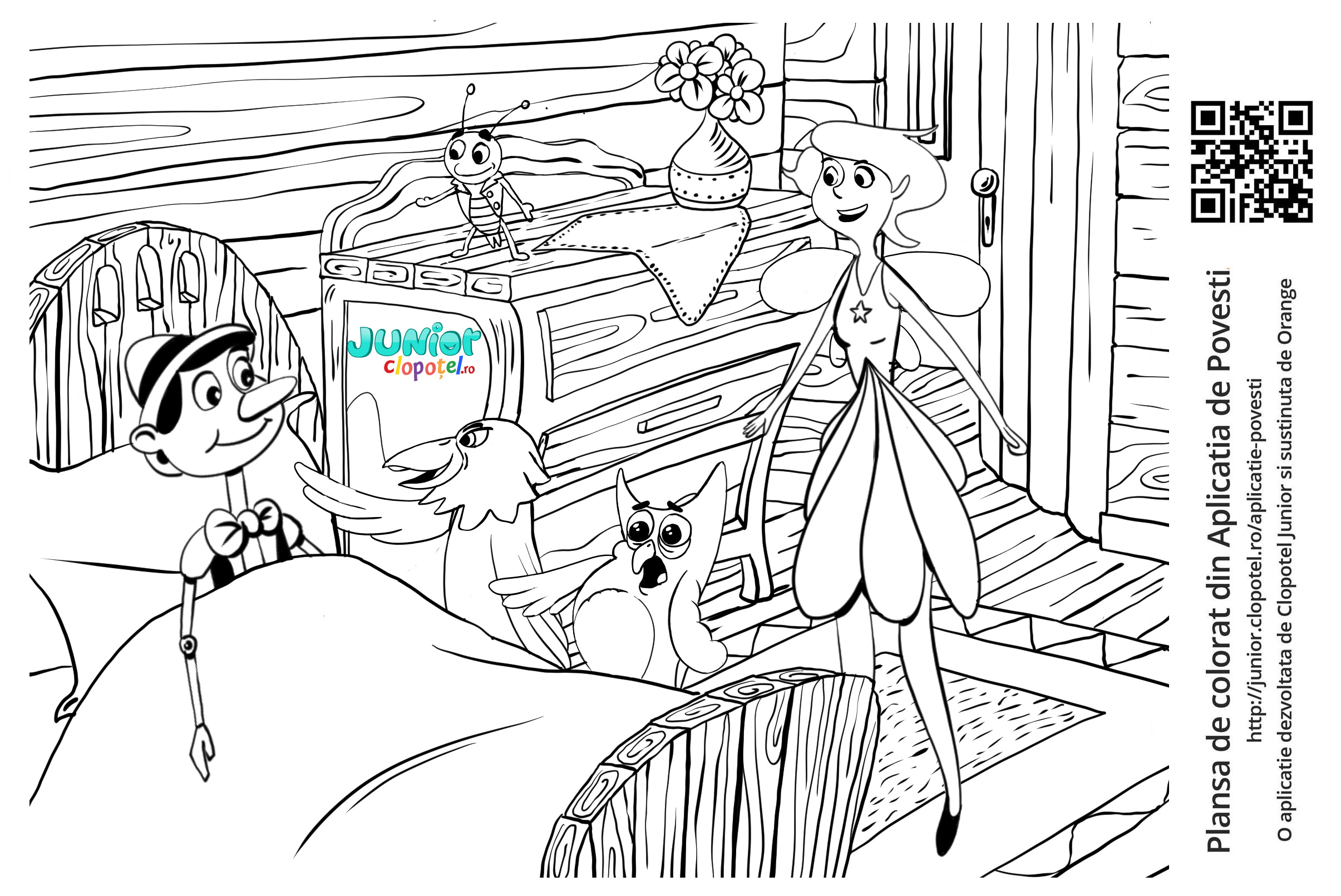 Descriere: Plansa de colorat cu Pinocchio, corbul, bufnita, greierul vorbitor si zana. Scena din aplicatia POVESTI. Daca vrei sa descoperi mai multe basme sau legende, descarca-ti aplicatia din Google Play sau App Store.