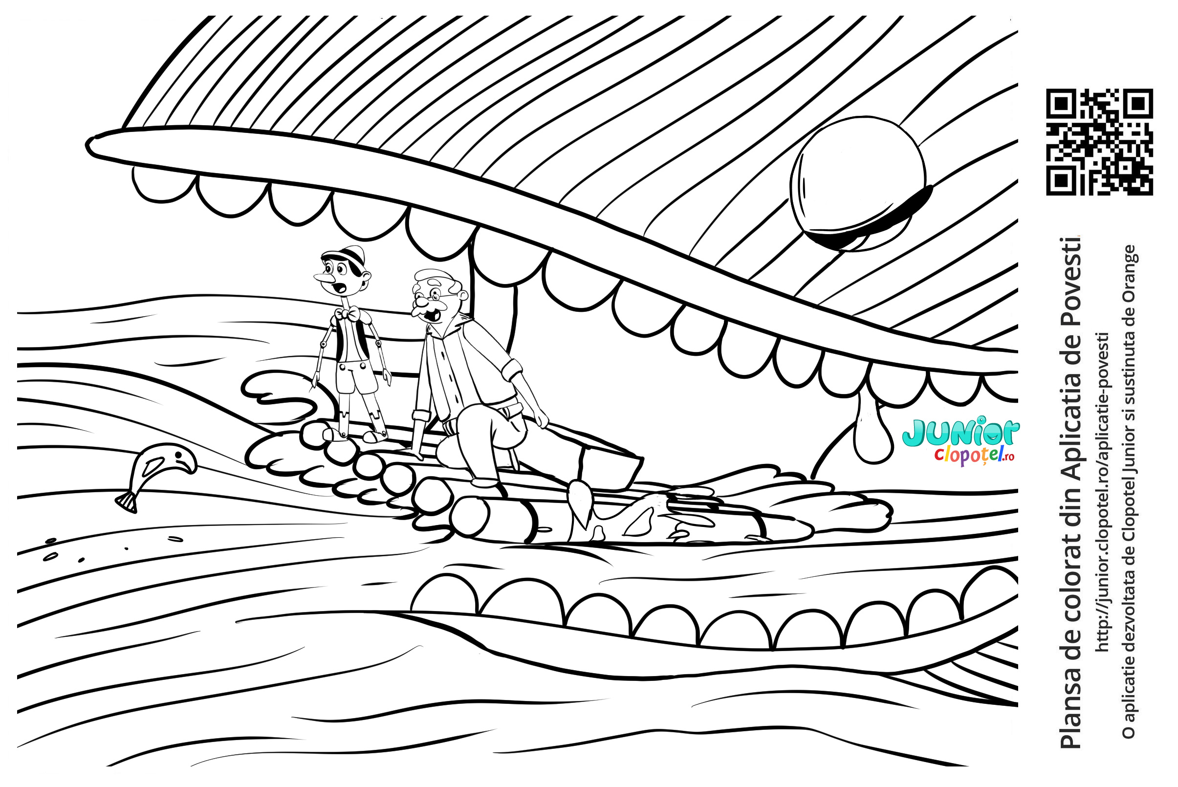 Descriere: Plansa de colorat cu Pinocchio si Gepetto iesind din balena. Scena din aplicatia POVESTI. Daca vrei sa descoperi mai multe basme sau legende, descarca-ti aplicatia din Google Play sau App Store.