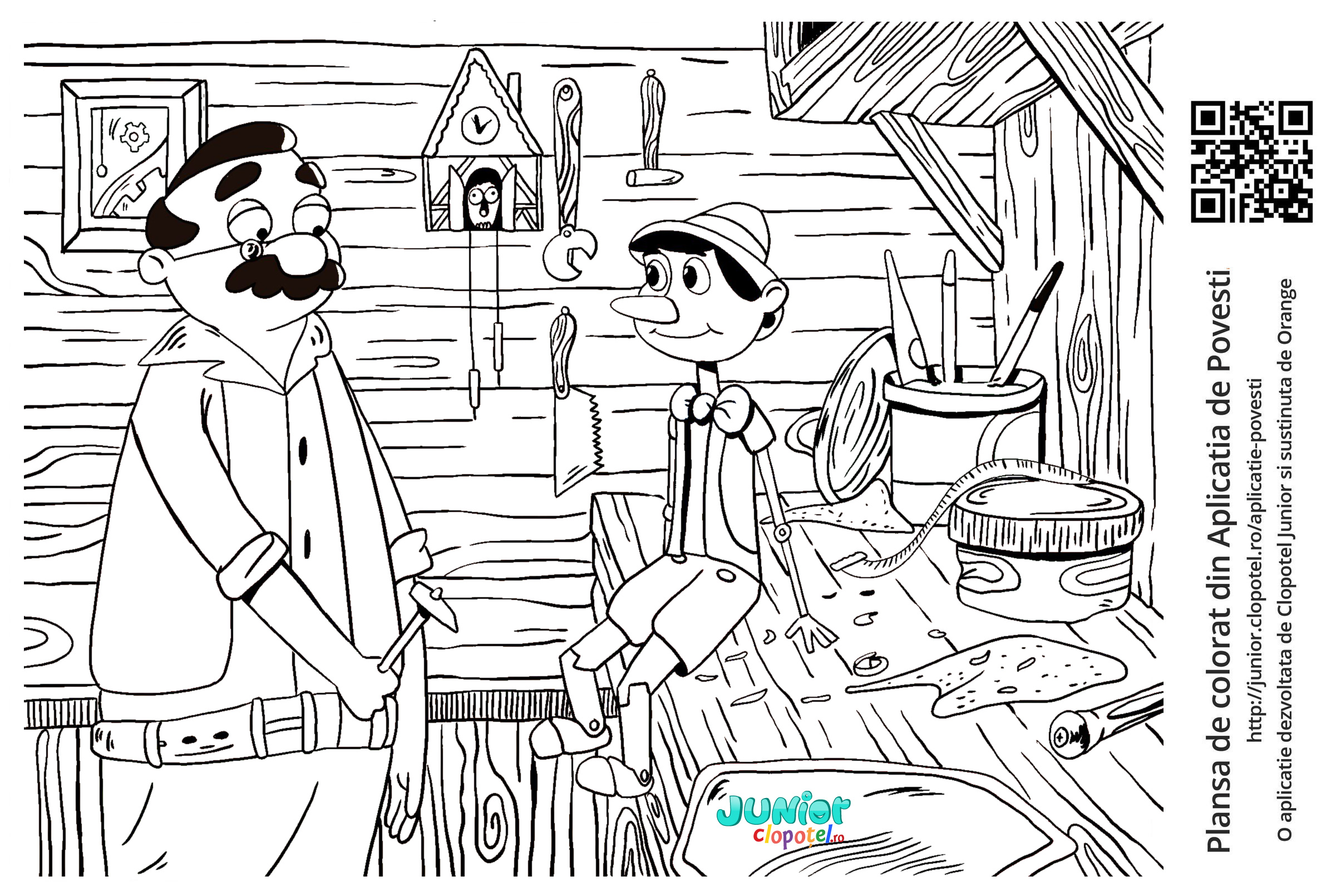 Descriere: Plansa de colorat cu Pinocchio si Gepetto. Scena din aplicatia POVESTI. Daca vrei sa descoperi mai multe basme sau legende, descarca-ti aplicatia din Google Play sau App Store.