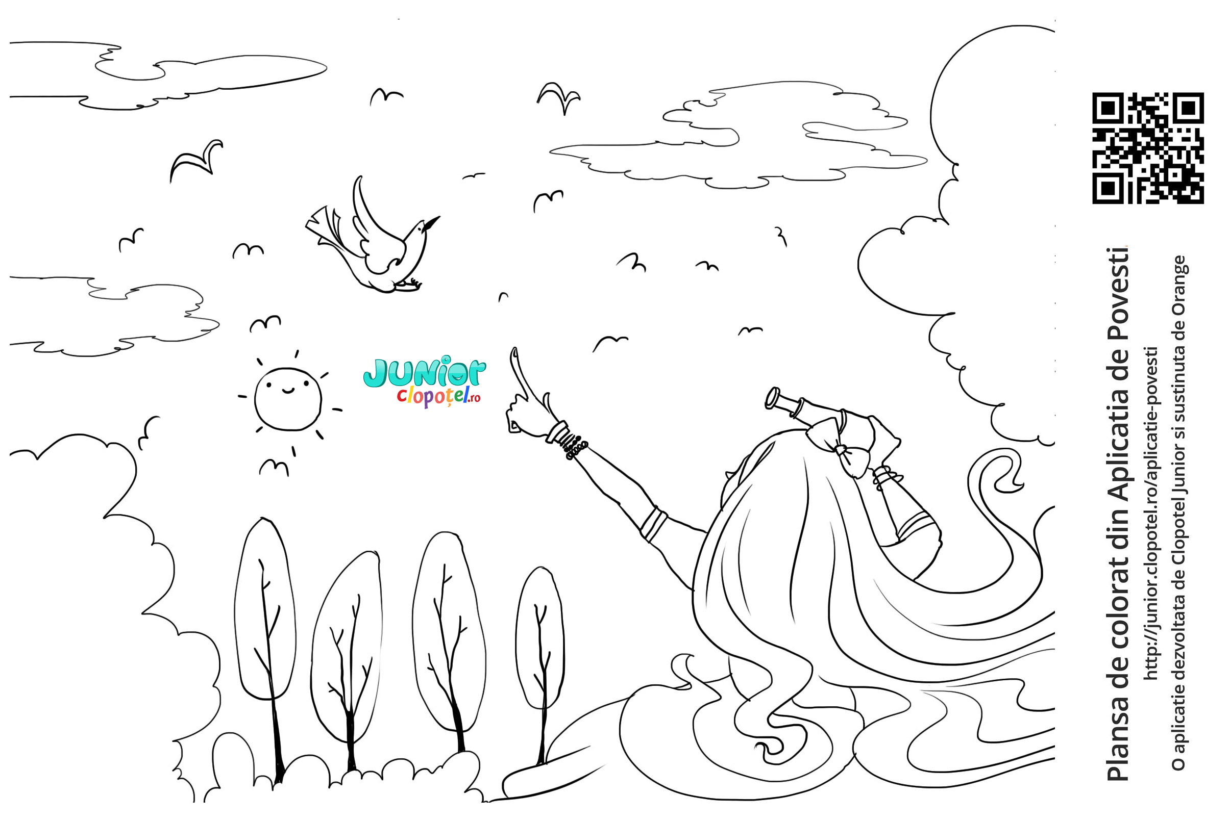 Descriere: Coloreaza-l pe Aleodor Imparat care s-a transformat in pui de corb incercand sa se ascunda de printesa, fata lui Verdes Imparat. Scena din aplicatia POVESTI. Daca vrei sa descoperi mai multe basme sau legende, descarca-ti aplicatia din Google Play sau App Store.