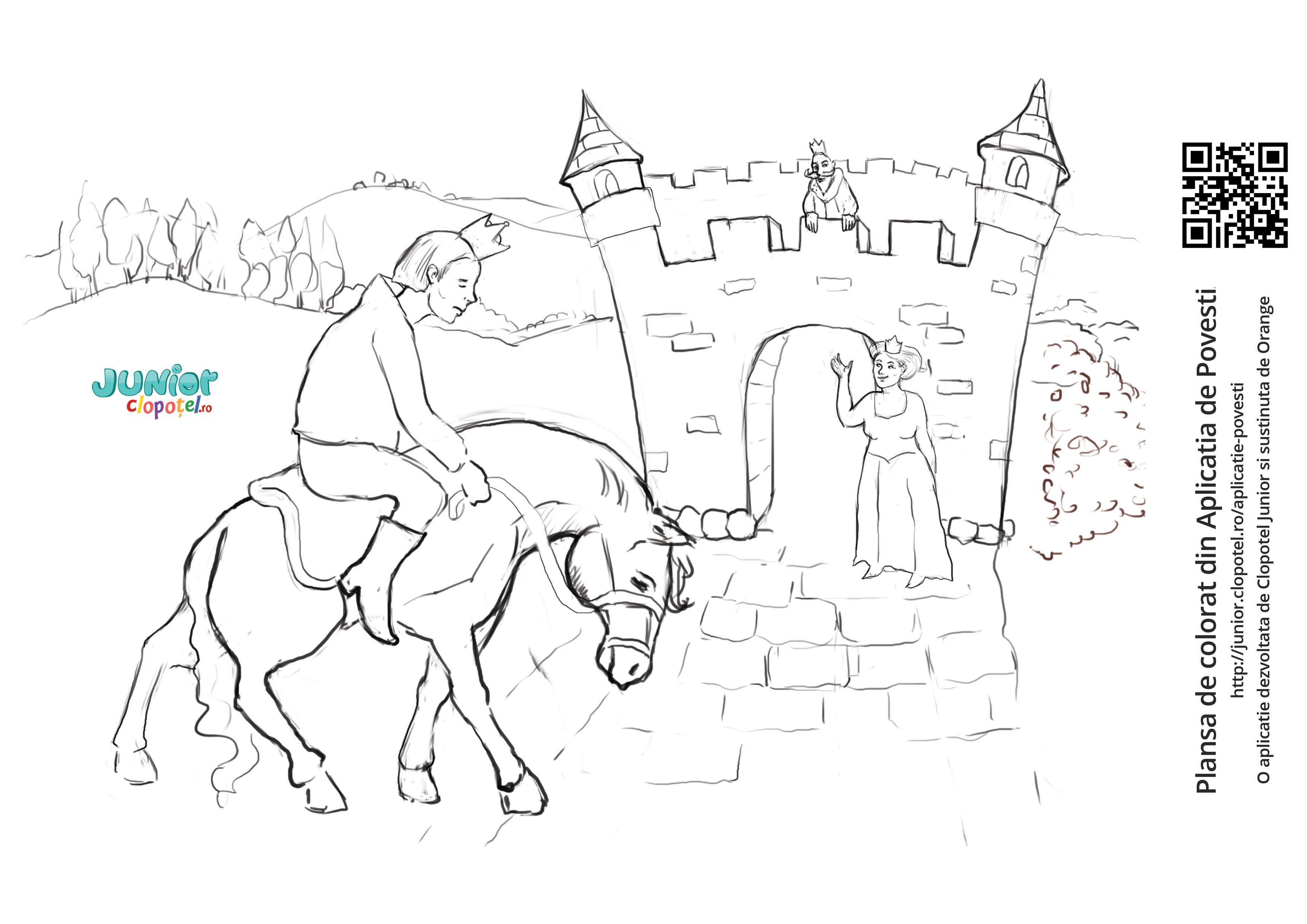 Descriere: Coloreaza plansa cu printul din povestea "Printesa Bob de Mazare". Scena din aplicatia POVESTI. Daca vrei sa descoperi mai multe basme sau legende, descarca-ti aplicatia din Google Play sau App Store.