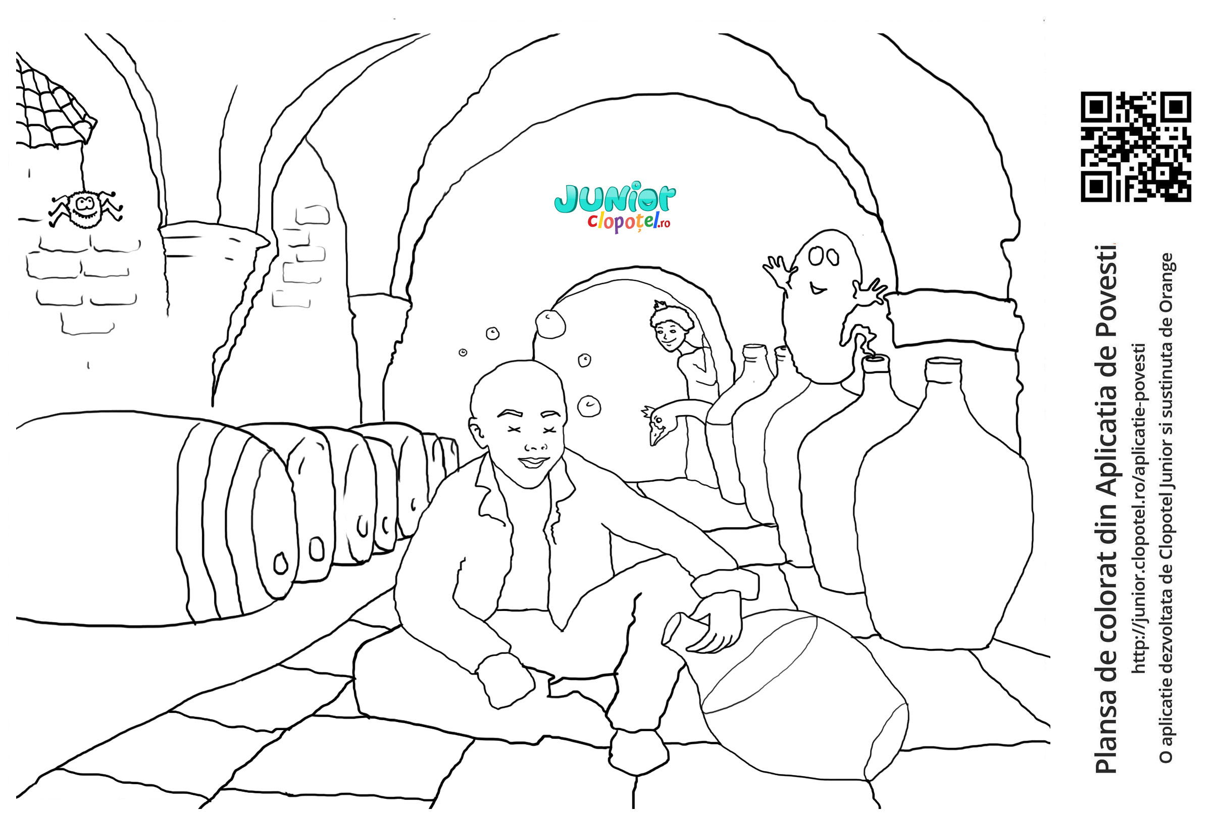 Descriere: Plansa de colorat cu Prostila si omul care poate bea o pivnita plina cu butoaie de vin. Scena din povestea "Gasca de aur" pe care o poti citi AICI.