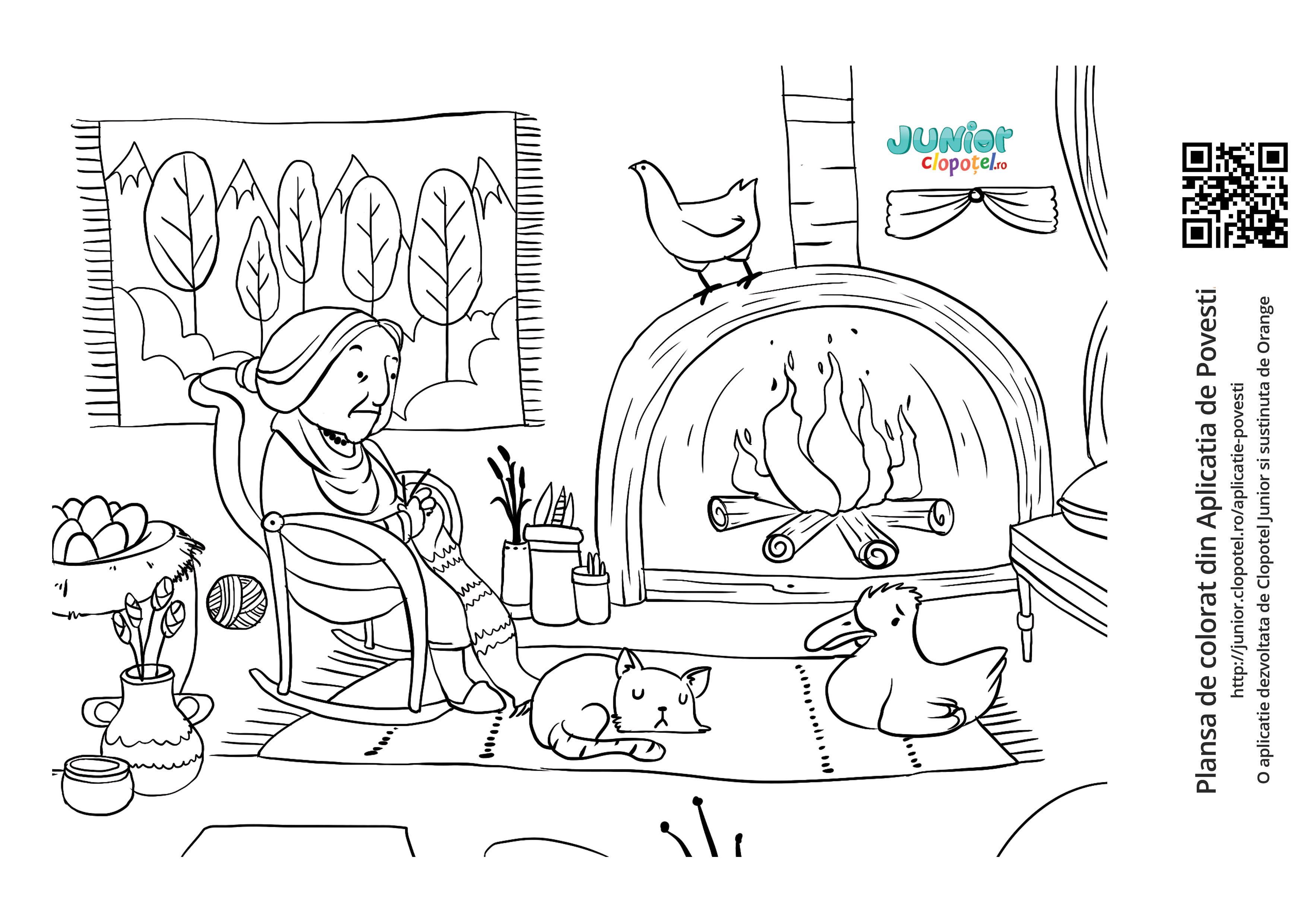 Descriere: Coloreaza plansa cu ratusca, babuta, motanul si gaina! Scena din "Ratusca cea urata" din aplicatia POVESTI. Daca vrei sa descoperi mai multe basme sau legende, descarca-ti aplicatia din Google Play sau App Store.