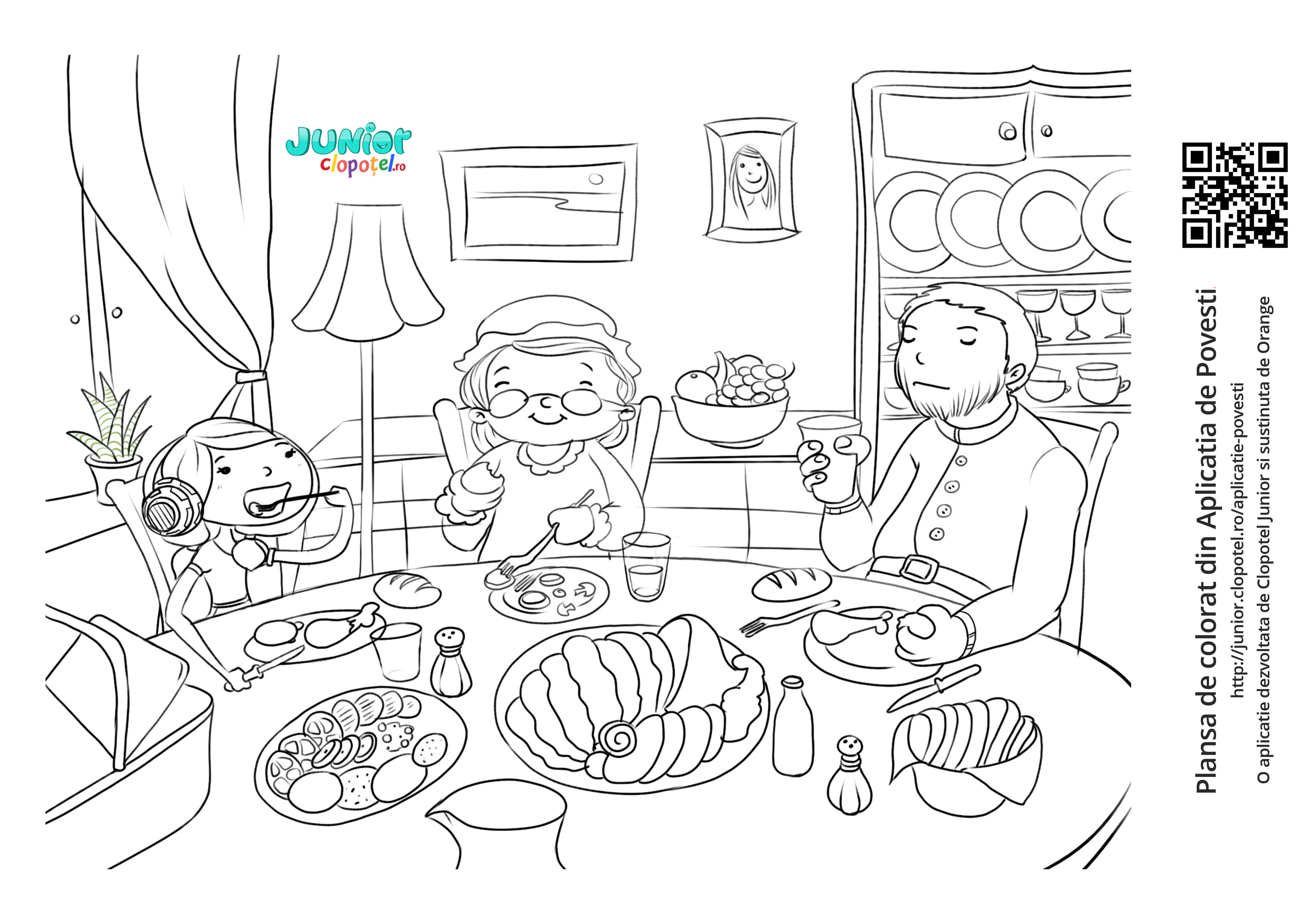 Descriere: Plansa de colorat cu Scufita Rosie, bunicuta si vanatorul. Scena din aplicatia "Povesti".