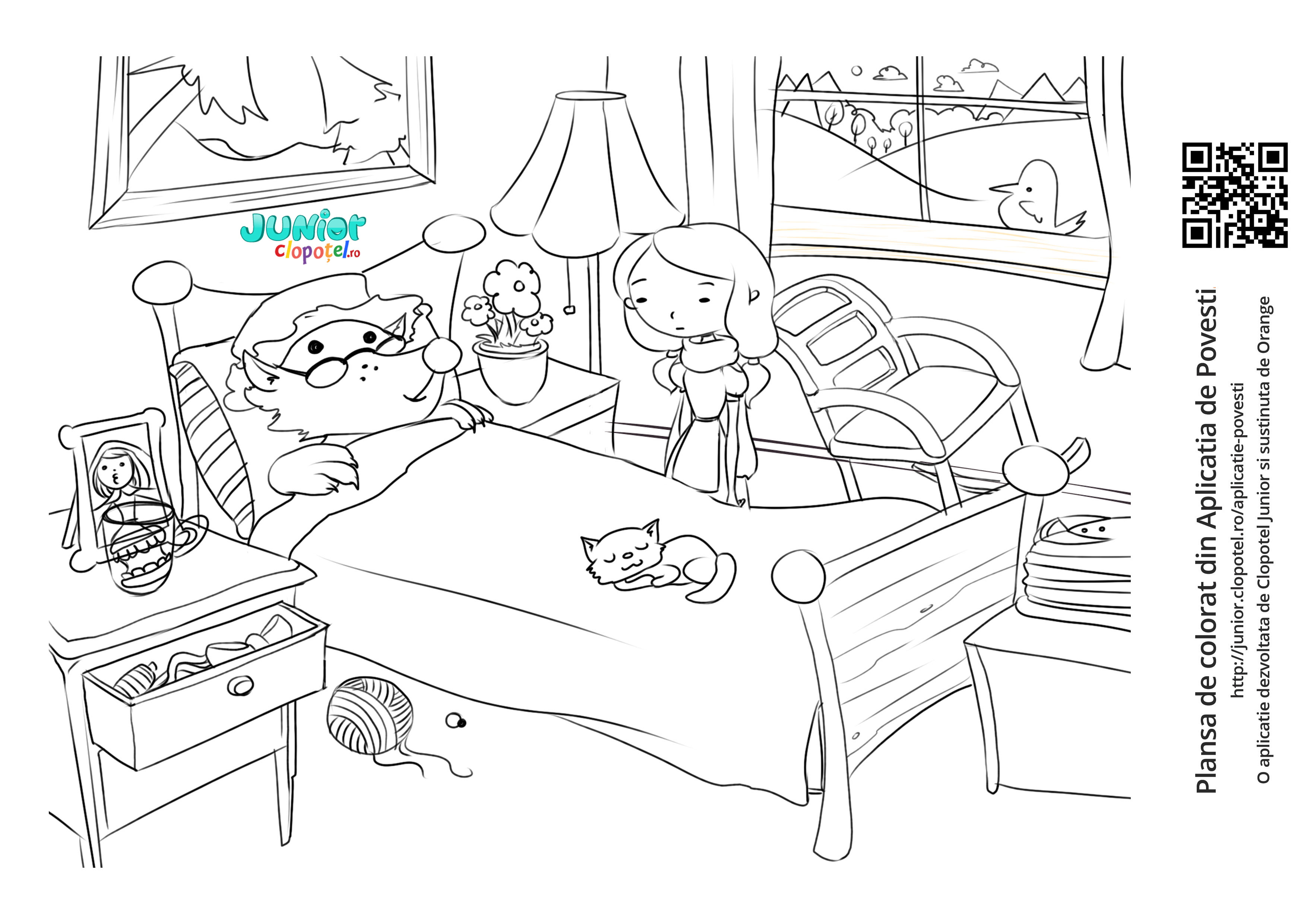Descriere: Plansa de colorat cu lupul deghizat in bunicuta Scufitei. Secventa din aplicatia Povesti.