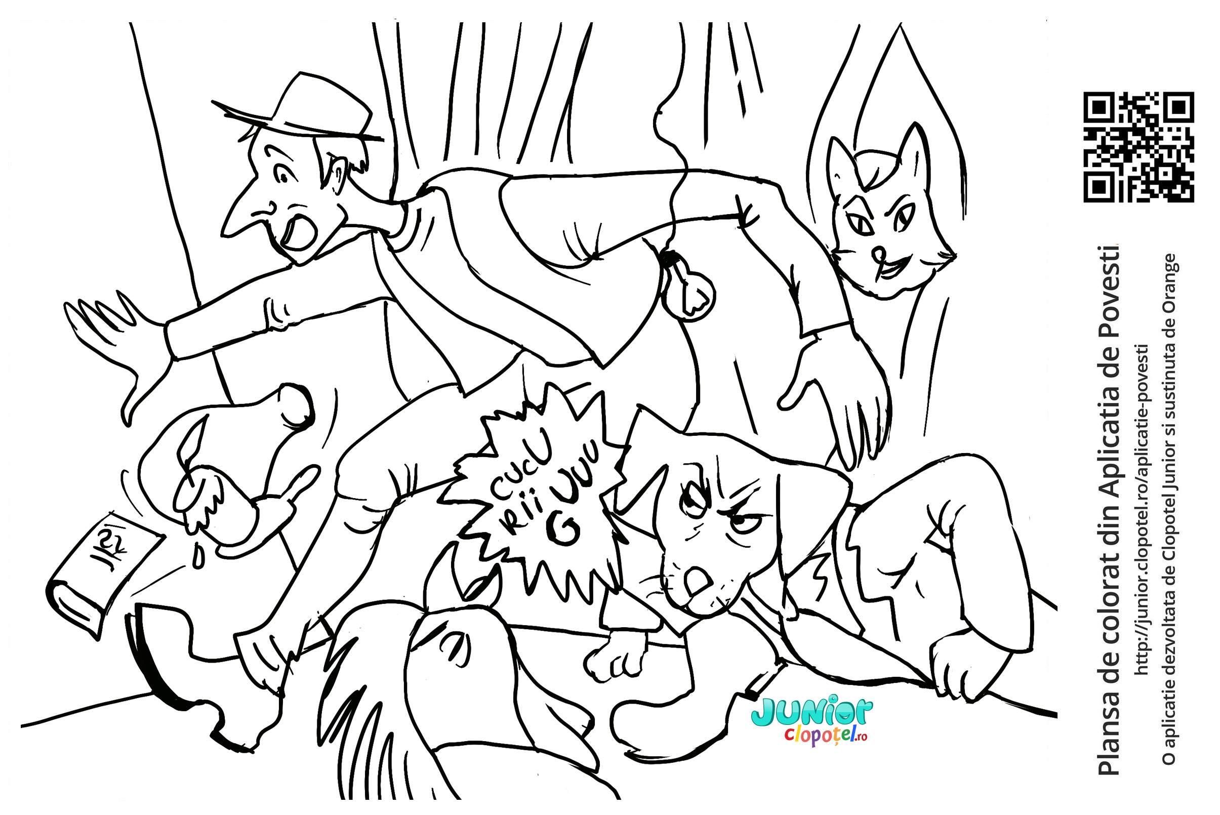 Descriere: Plansa de colorat cu talharii goniti de magar, catel, pisica si cocos. Scena din "Muzicantii din Bremen" din aplicatia POVESTI. Daca vrei sa descoperi mai multe basme sau legende, descarca-ti aplicatia din Google Play sau App Store.