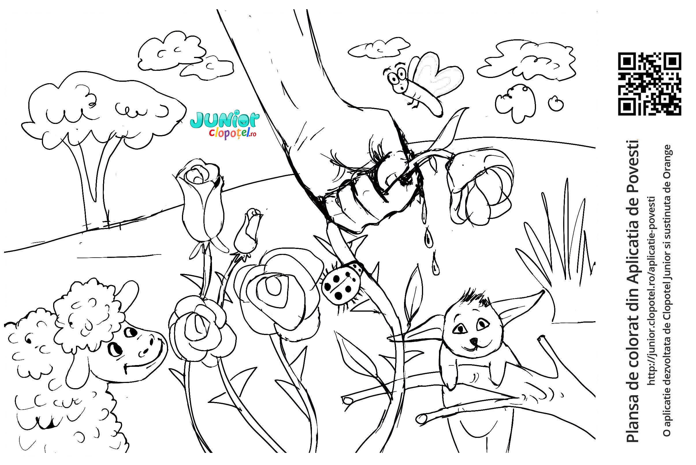 Descriere: Plansa de colorat cu trandafirul cu ghimpi care din cauza picaturilor de sange devine un trandafir rosu. Scena din povestea Legenda Trandafirului si a Scaiului din aplicatia POVESTI. Daca vrei sa descoperi mai multe basme, descarca-ti aplicatia din Google Play sau App Store.