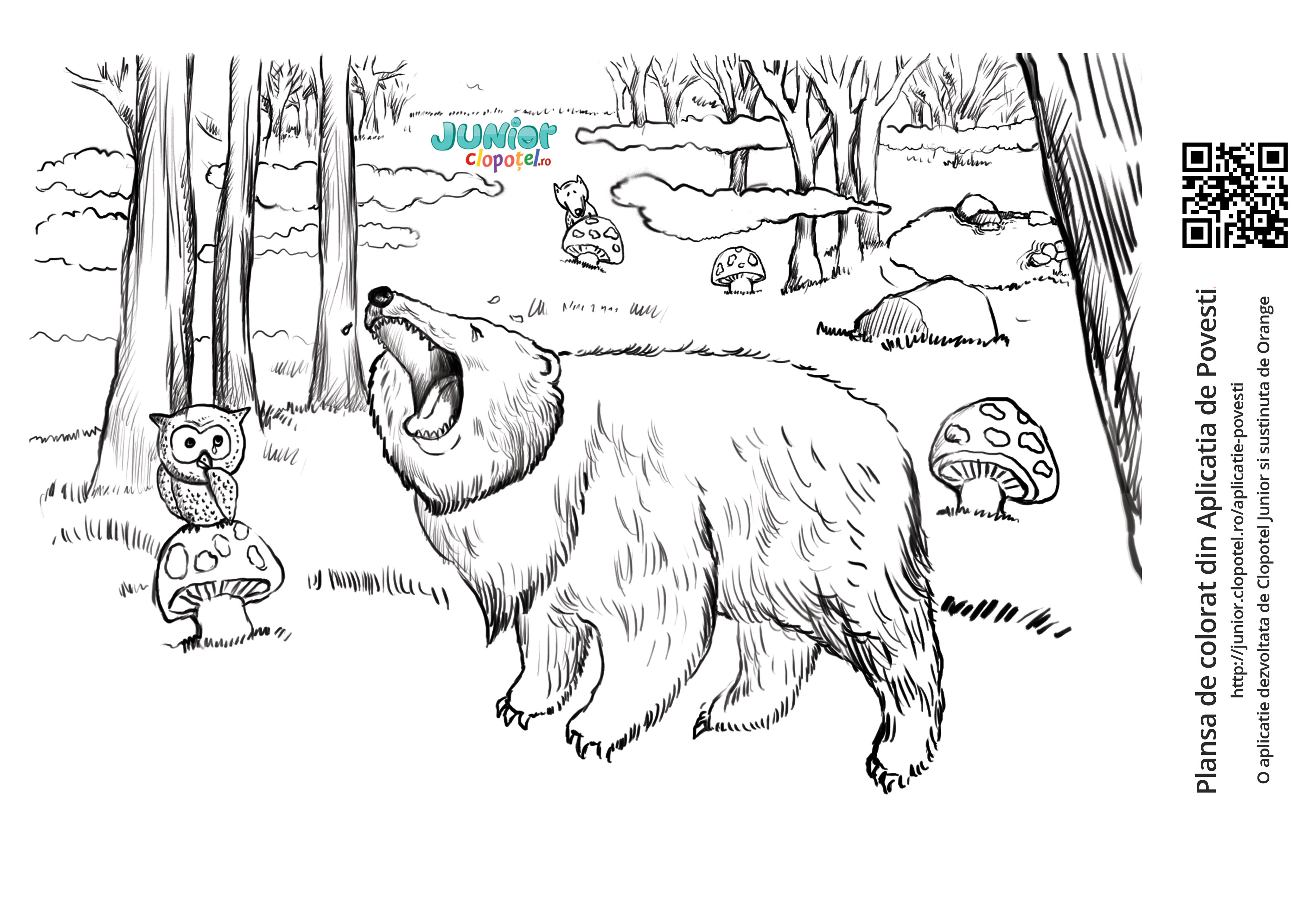 Descriere: Coloreaza plansa cu ursul care plange dupa coada ce a ramas in lacul inghetat. Scena din povestea "Ursul pacalit de vulpe". Citeste sau asculta povestea ori verifica-ti cunostintele in testul "Ursul pacalit de vulpe".