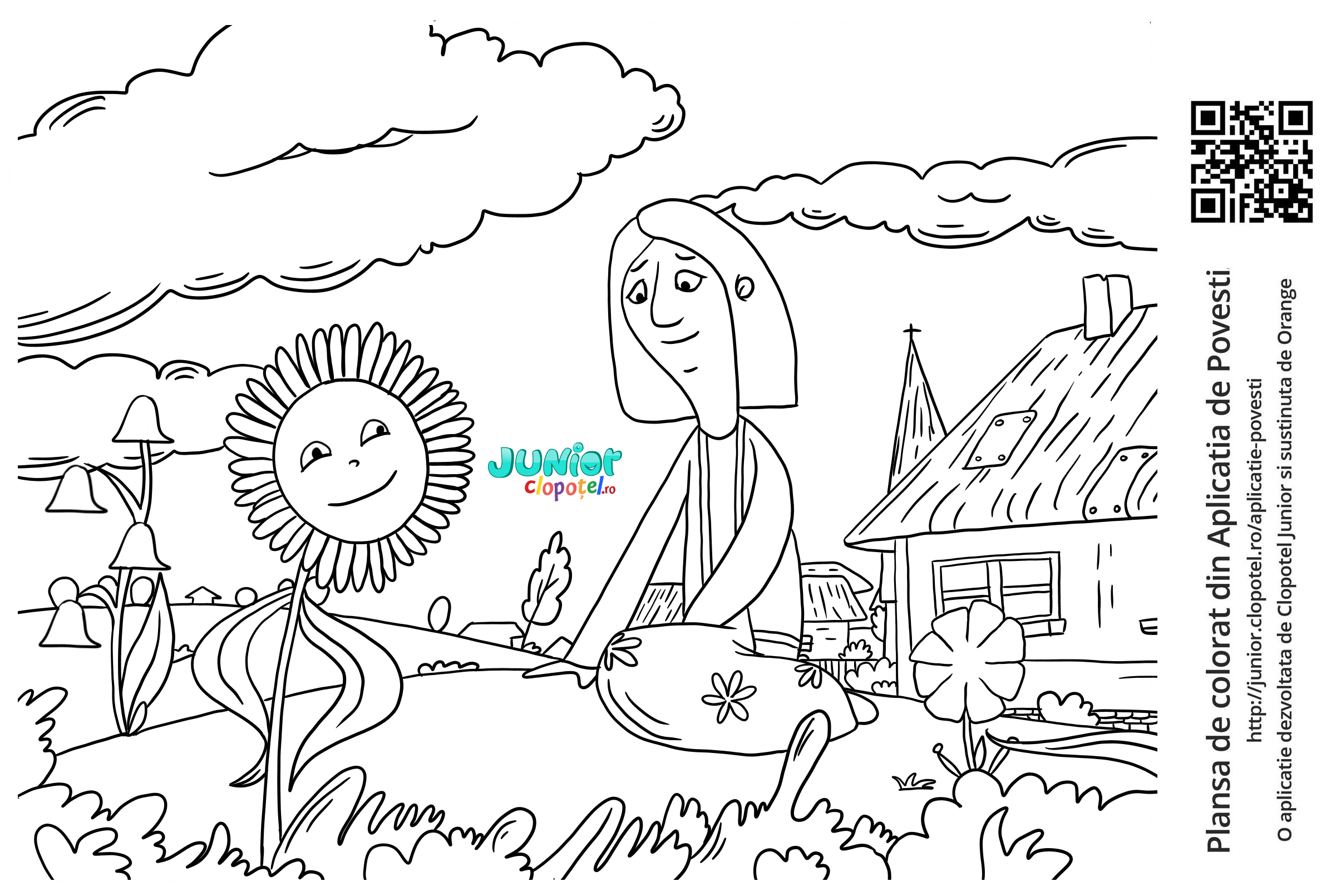Descriere: Plansa de colorat cu o floare vorbind cu Viorica. Scena din "Povestea Viorelei" din aplicatia POVESTI. Daca vrei sa descoperi mai multe basme, descarca-ti aplicatia din Google Play sau App Store.