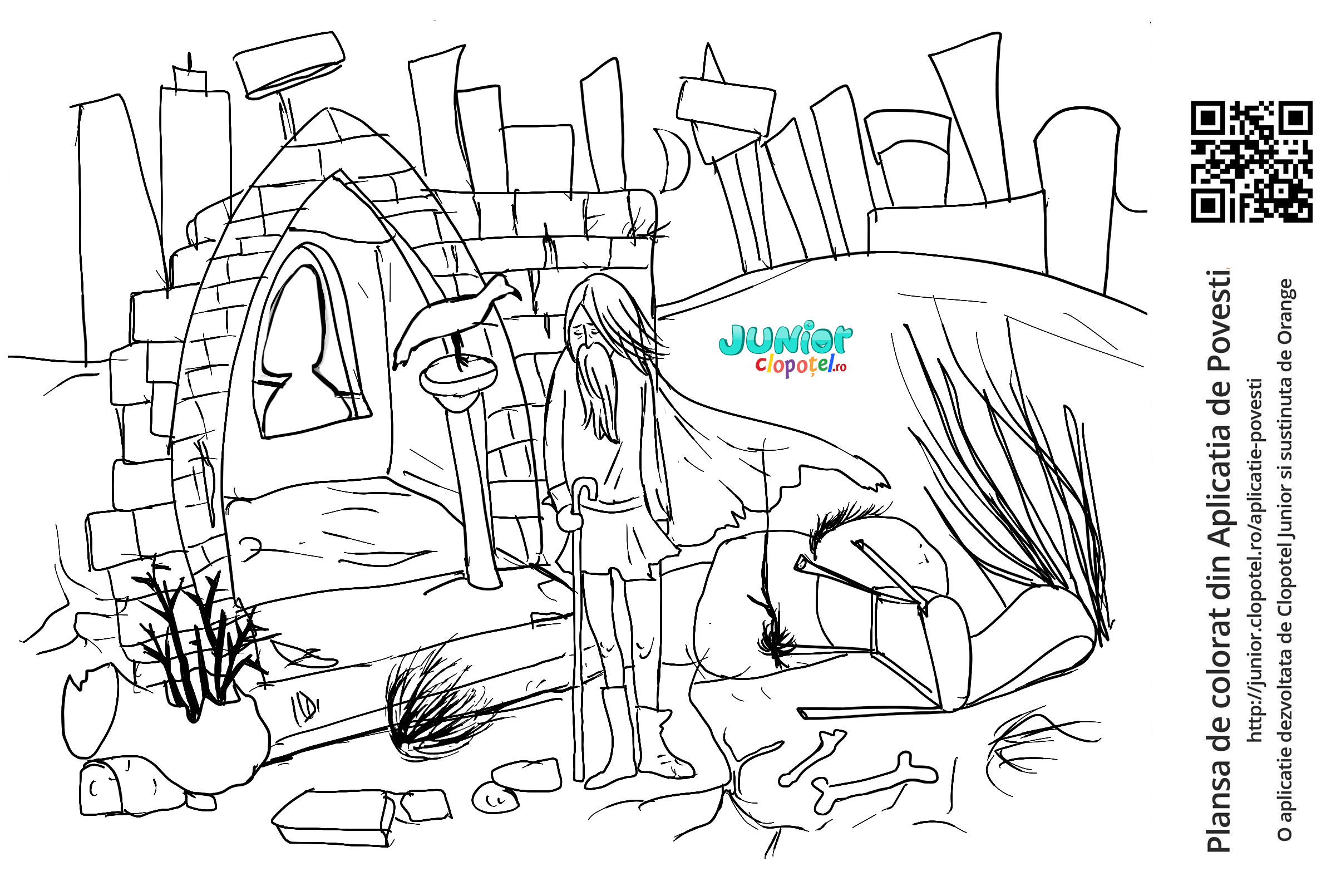 Descriere: Coloreaza plansa cu Fat Frumos imbatranit de blestemul din Valea Plangerii. Scena din povestea Tinerete fara batranete si viata fara de moarte din aplicatia POVESTI. Daca vrei sa descoperi mai multe basme, descarca-ti aplicatia din Google Play sau App Store.