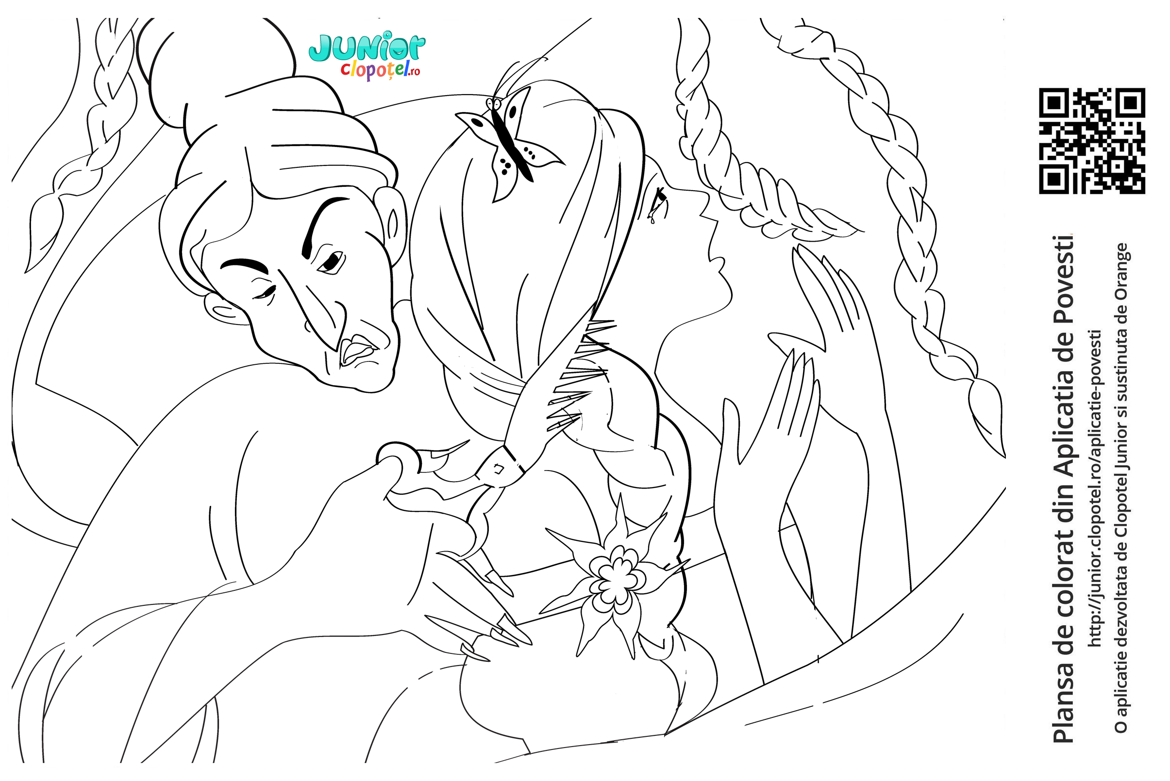 Descriere: Plansa de colorat cu parul lui Rapunzel taiat de vrajitoare.