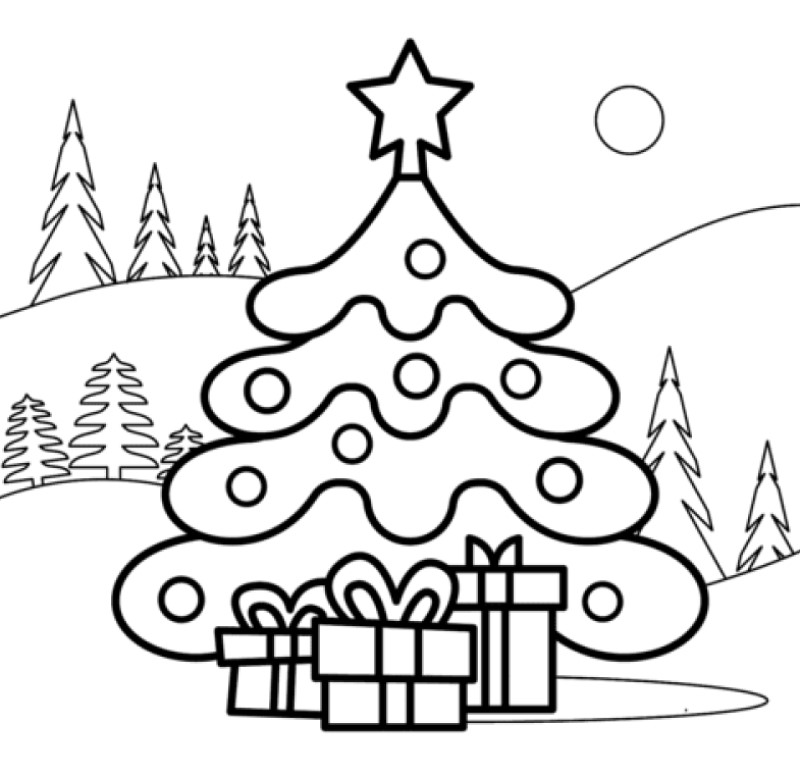 Descriere: Plansa de colorat cu un brad plin de cadouri pe langa el.