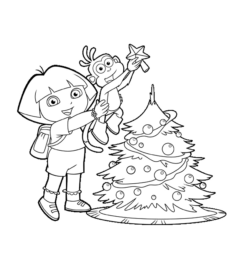 Descriere: Plansa de colorat cu Dora si Boots care impodobesc bradul de Craciun.