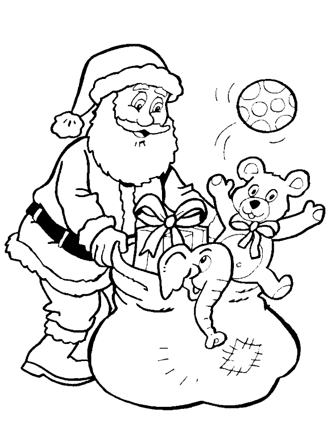 Descriere: Plansa de colorat cu Mos Craciun si jucariile cadou.