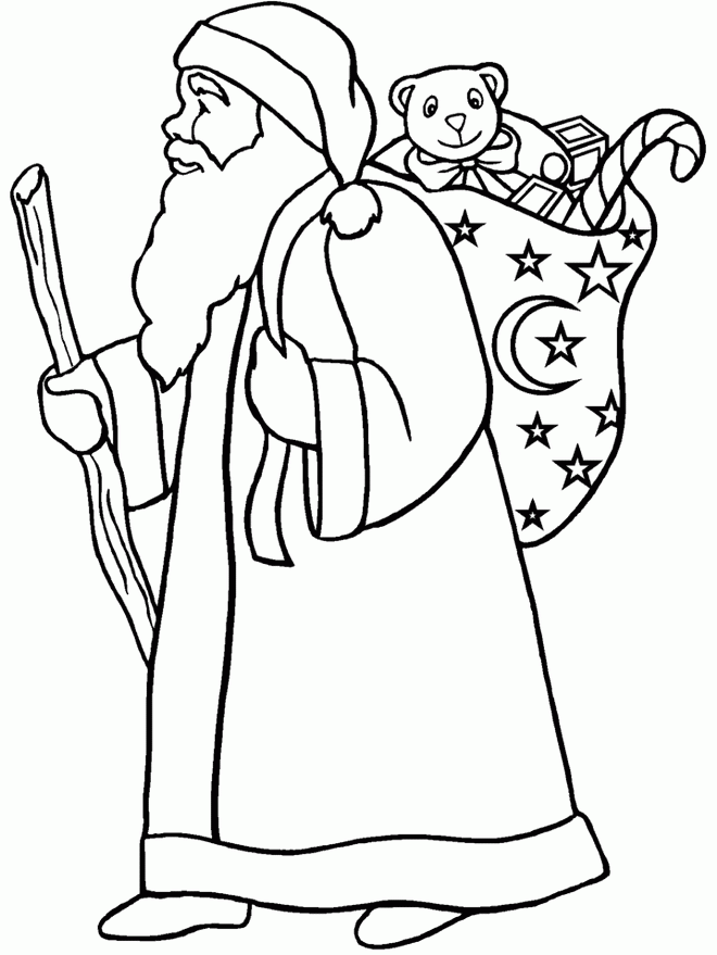 Descriere: Plansa de colorat cu Mos Craciun si sacul lui mare de cadouri.