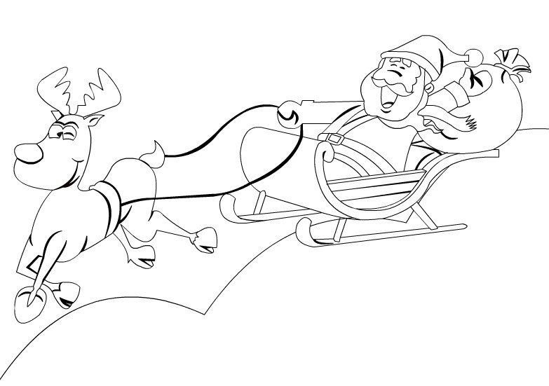 Descriere: Plansa de colorat cu mosul, renul si cu sania.