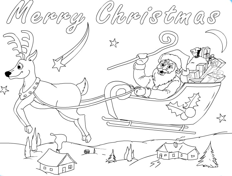 Descriere: Plansa de colorat cu sania, renul si Mos Craciun.