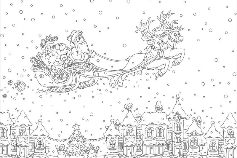 Descriere: Plansa de colorat cu sania cu zurgalai si cu Mos Craciun.