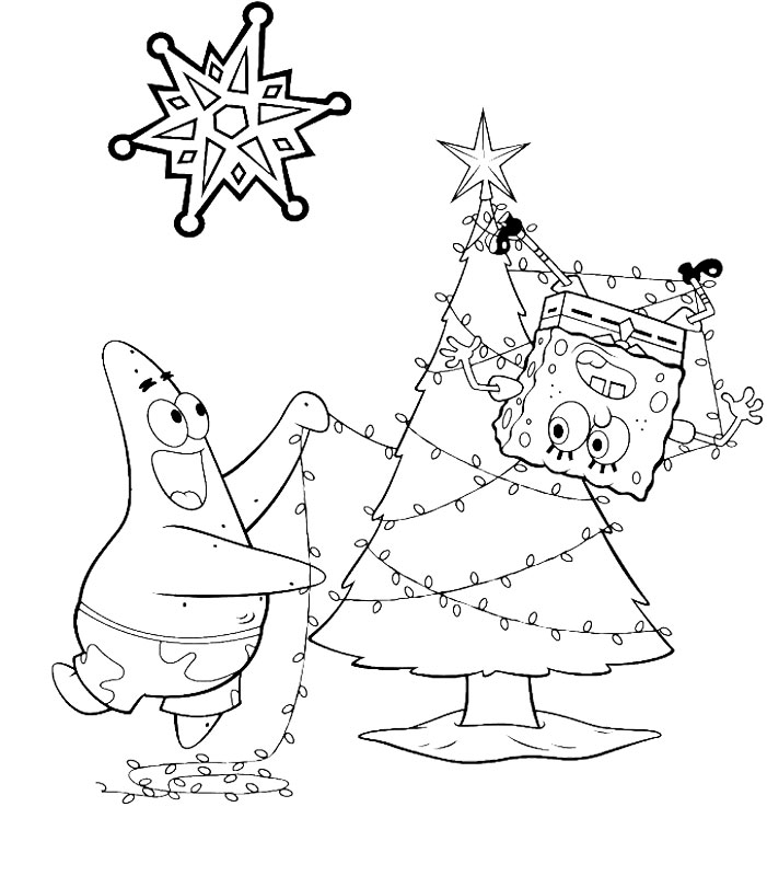 Descriere: Plansa de colorat cu Spongebob si Patrick imodobind bradutul de Craciun.