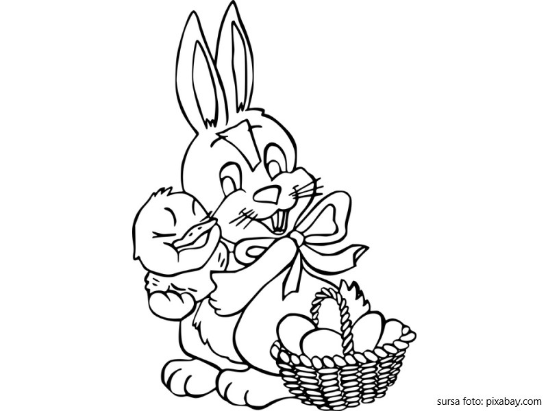 Descriere: Plansa de colorat cu iepurasul, bobocul si cosul cu oua de Paste.