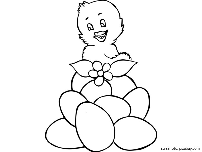 Descriere: Plansa de colorat cu puisorul si ouale de Paste.