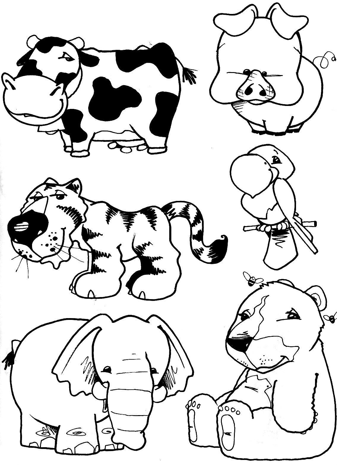 Descriere: Vaca, purcelul, tigrul, papagalul, elefantul si ursul te asteapta sa-i colorezi.