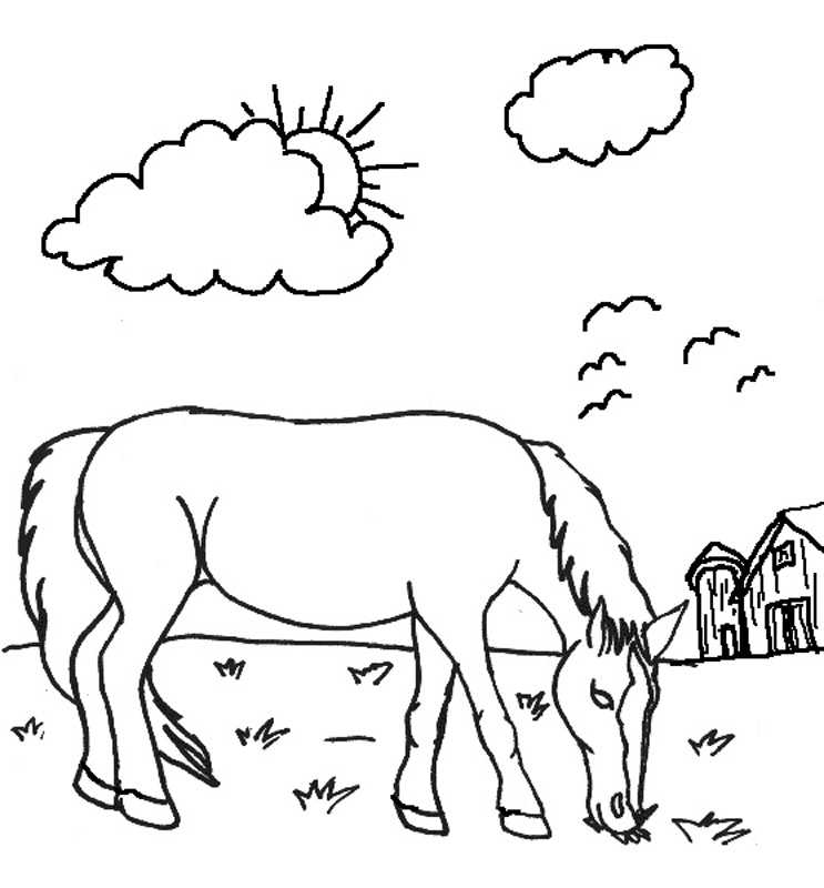 Descriere: Plansa de colorat cu un cal care paste iarba pe camp.