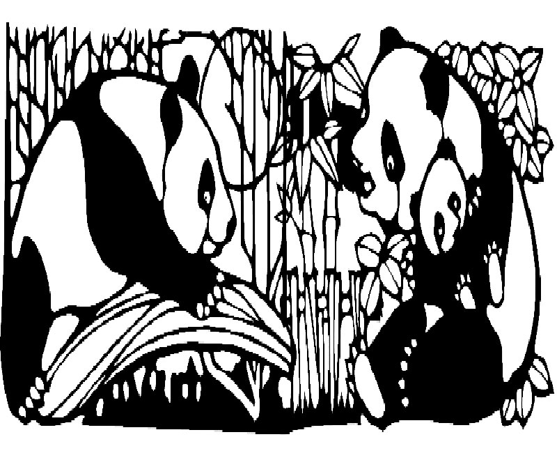 Descriere: Plansa de colorat cu o familie de ursi panda.