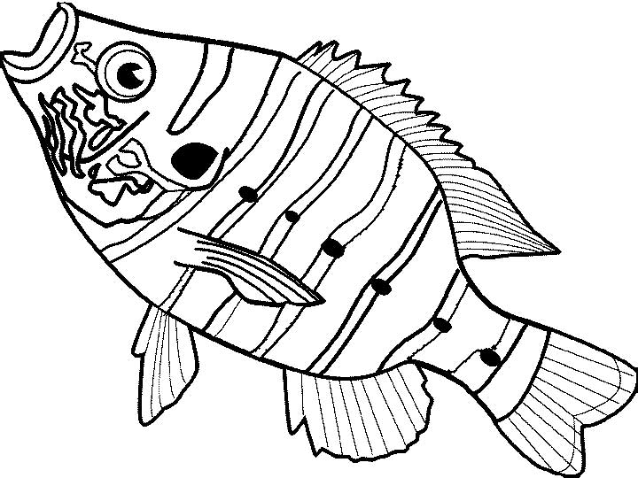 Descriere: Plansa de colorat cu un peste dungat cu buline pe burta.