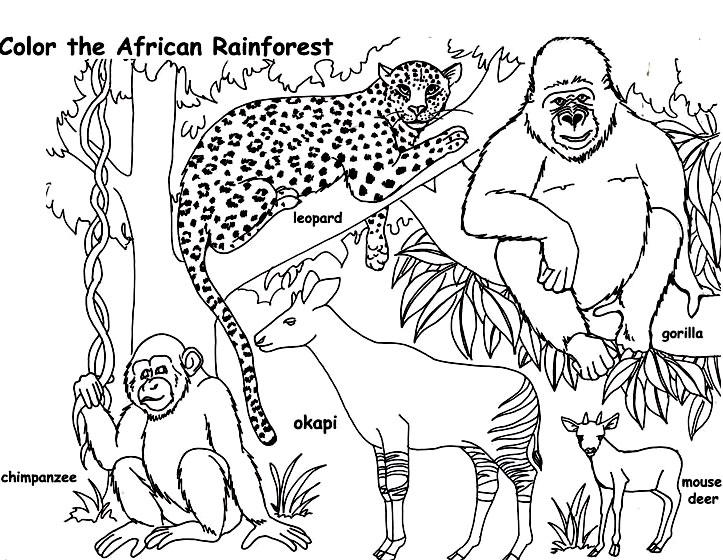 Descriere: Coloreaza animalele din padurea tropicala. Plansa contine cateva animale: gorila, cimpanzeu, leopard, okapi (din familia girafei, traieste in padurile din Congo).