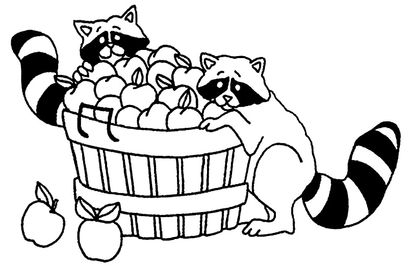 Descriere: Desenul cu ratonii care fura merele din cos a ramas fara culori. Esti invitat sa colorezi aceasta plansa cu animale.