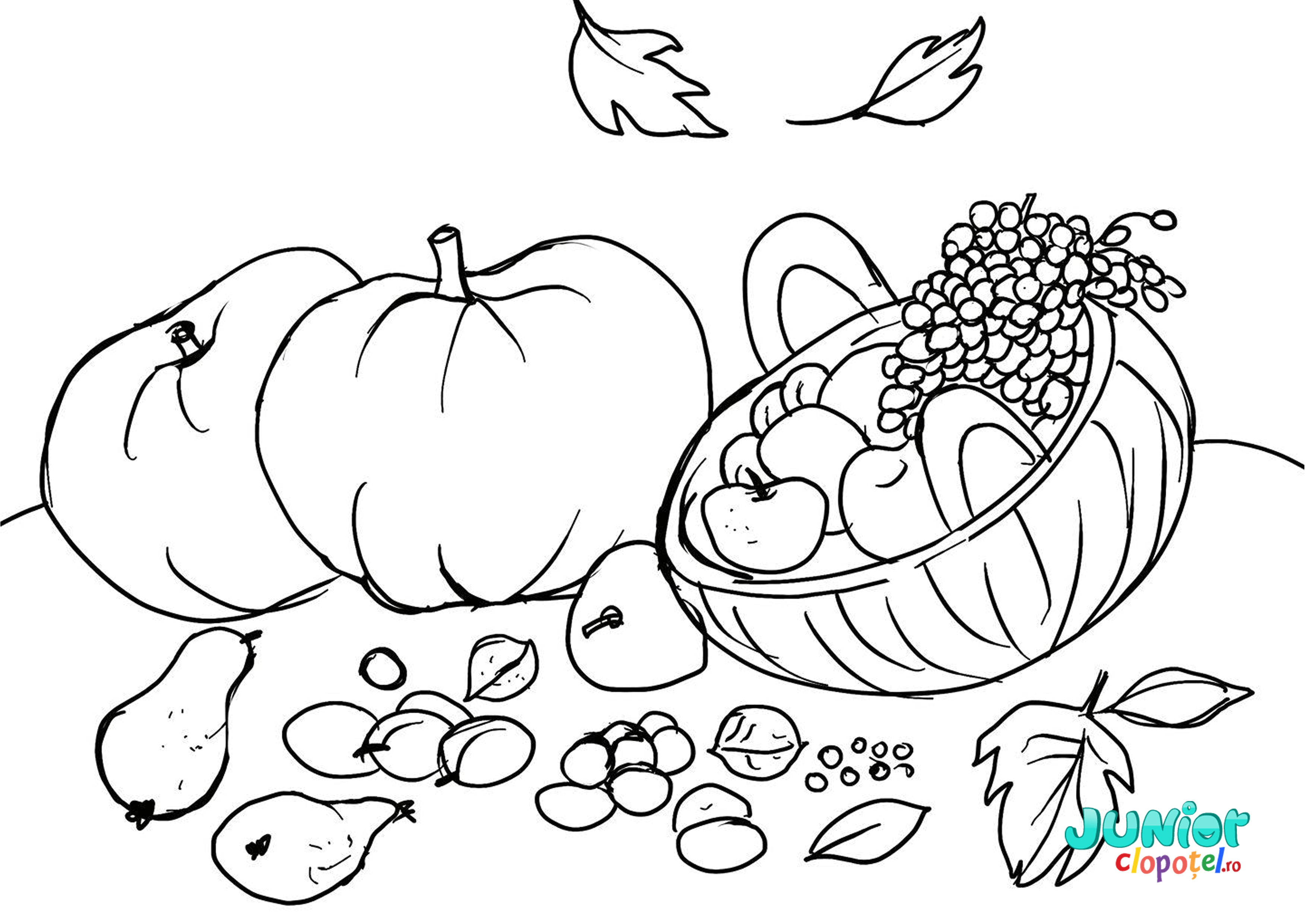Descriere: Plansa de colorat cu bostani si multe fructe de toamna.