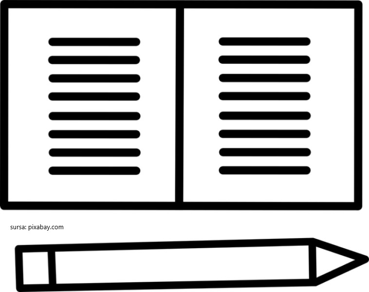 Descriere: Plansa de colorat cu un caiet si creion, simbol al noului an scolar.