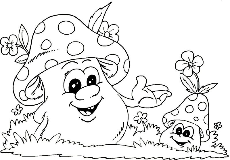 Descriere: Plansa de colorat cu doua ciupercute care intampina primavara cu floricele.