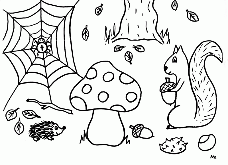 Descriere: In padure se ascund tot felul de vietati. Coloreaza aceasta plansa de toamna!