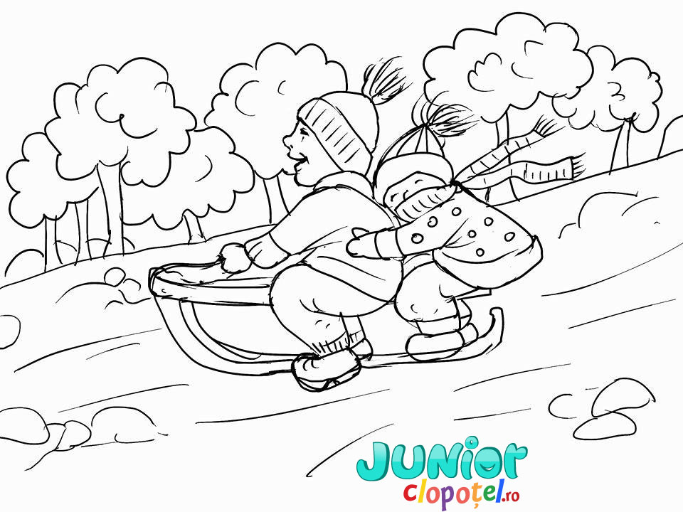 Descriere: Plansa de colorat cu doi copii ce se dau cu sania pe derdelus.