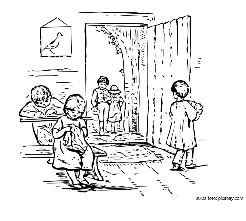 Descriere: Plansa de colorat cu elevi la biblioteca.