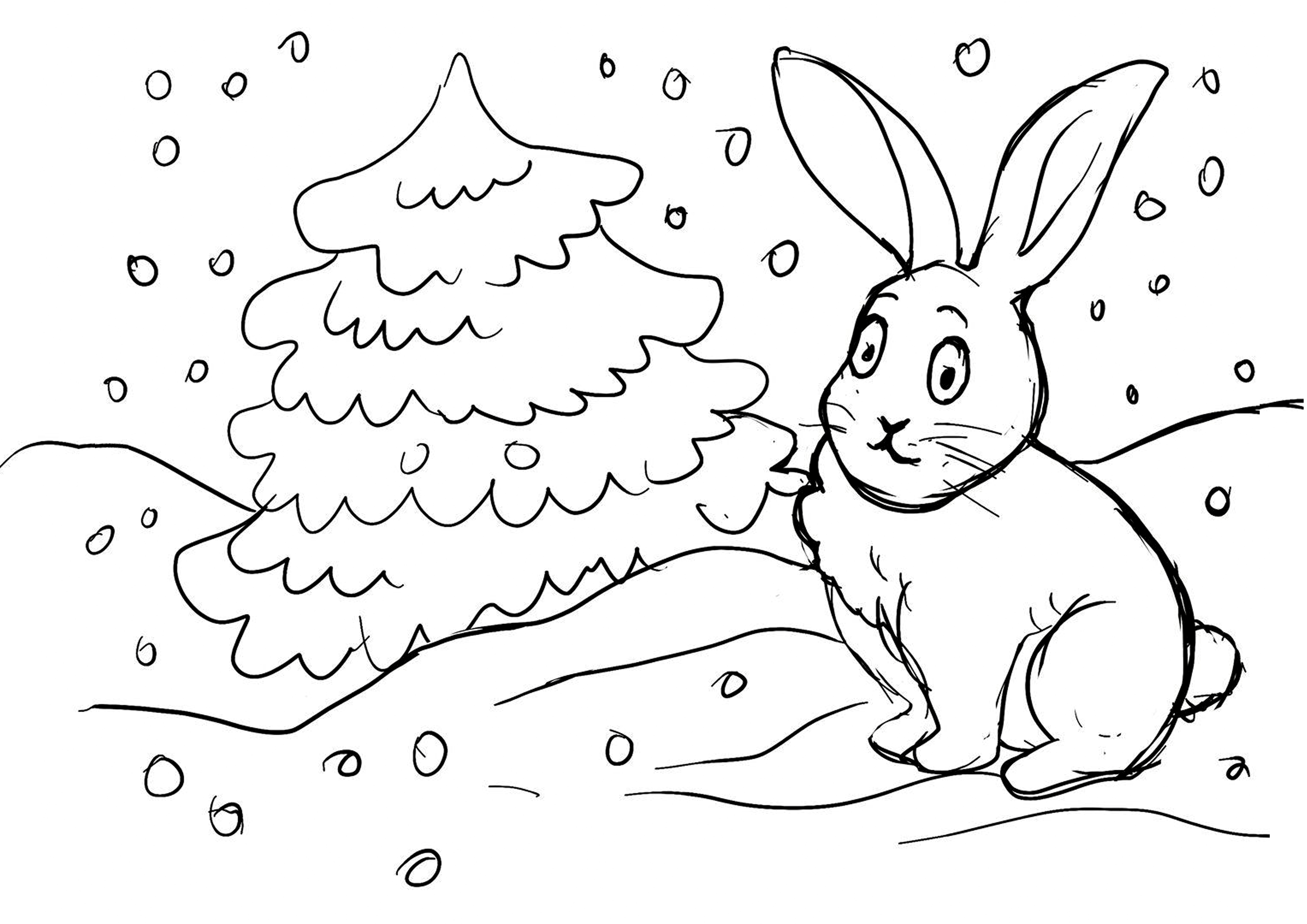 Descriere: Plansa de colorat cu iepurasul, bradul si zapada.