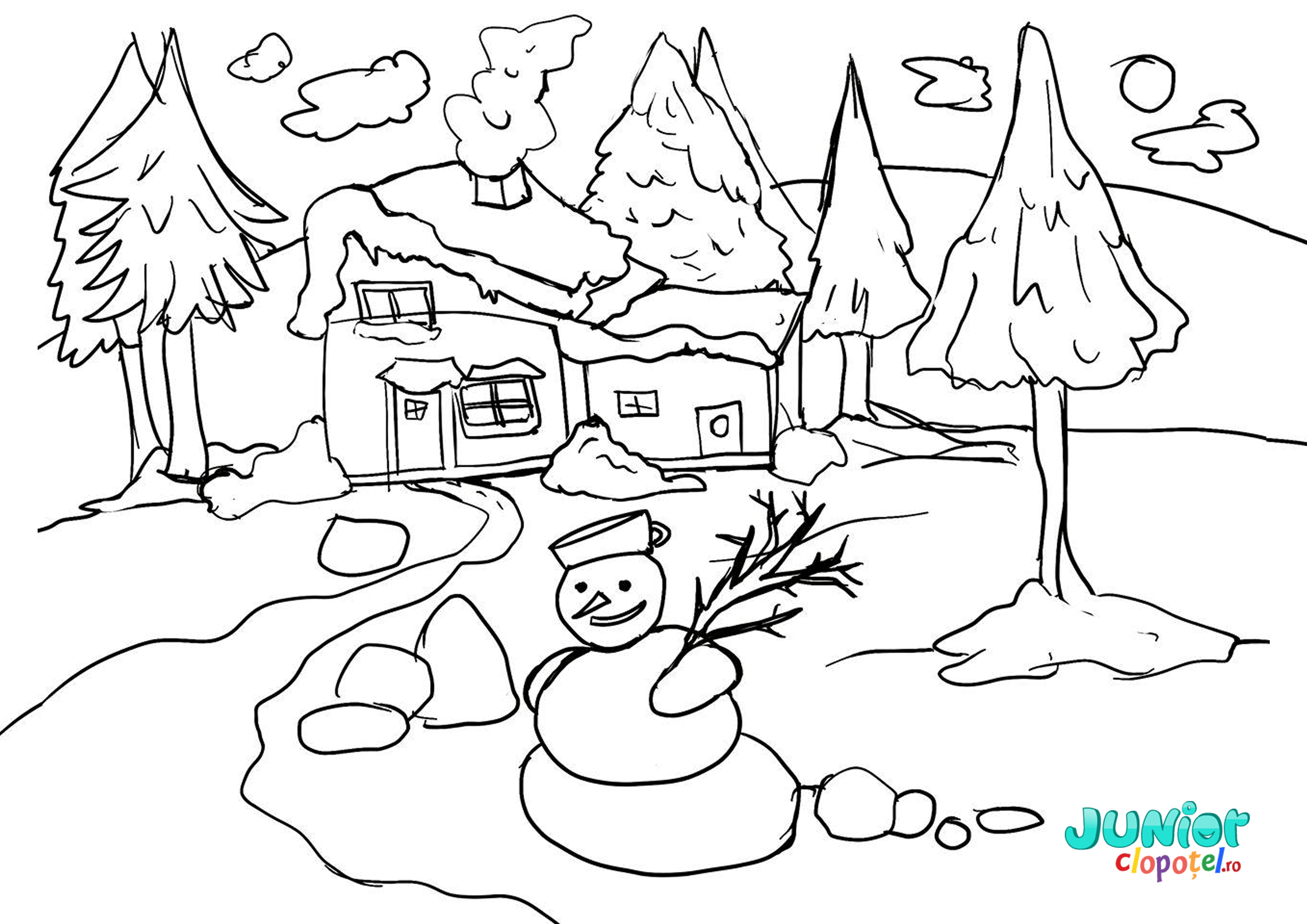 Descriere: Plansa de colorat cu omul de zapada din fata casei.