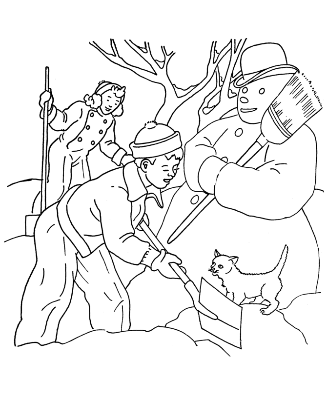 Descriere: Coloreaza aceasta plansa cu om de zapada si oameni bucurosi.