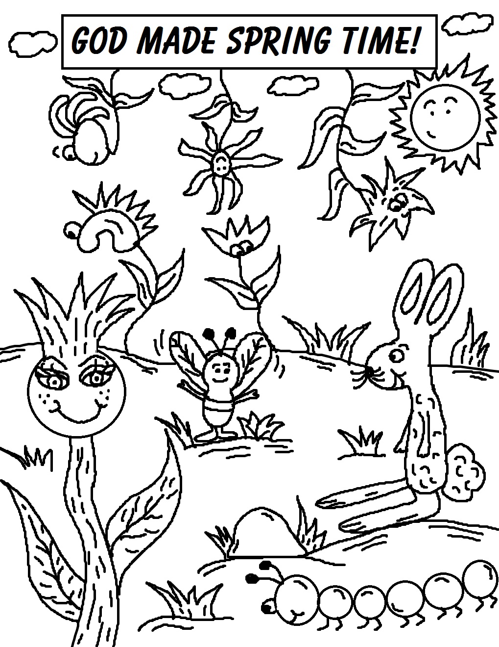Descriere: Plansa de colorat cu un peisaj de primavara ce are animale, insecte si flori.