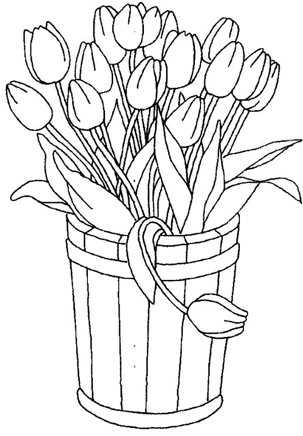 Descriere: Coloreaza plansa cu lalele asezate intr-o galetusa de lemn.