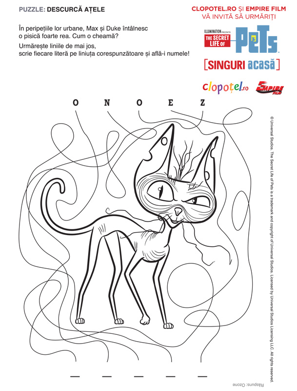 Descriere: Descurca atele si vezi unde ajunge fiecare litera. Urmareste firul si pozitioneaza litera pe linia de sub pisica. Planse cu jocuri ce au personaje din animatia "Singuri acasa" distribuita de Empire Film.