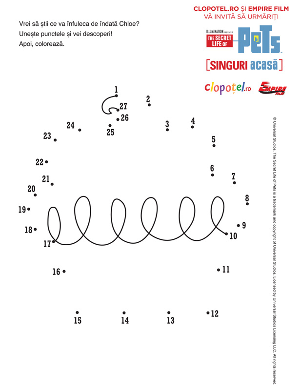 Descriere: Vrei sa stii ce va infuleca de indata Chloe? Uneste punctele si vei descoperi! Apoi coloreaza. Planse cu jocuri ce au personaje din animatia "Singuri acasa" distribuita de Empire Film.