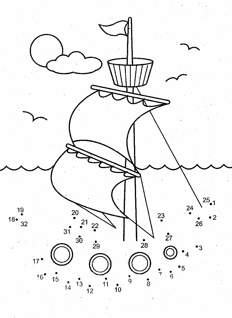 Descriere: Uneste punctele si vezi cum arata corabia din plansa de colorat.