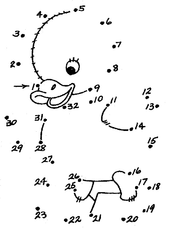 Descriere: Uneste punctele din plansa si vezi cum arata ratusca. Coloreaza ratusca!