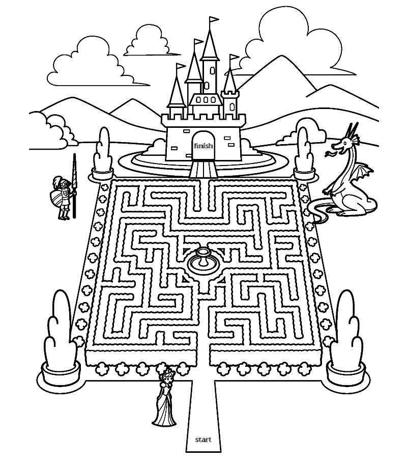 Descriere: Printesa trebuie sa ajunga la castel dar gradina prin care trece este un mare labirint. Coloreaza pentru printesa traseul pe care trebuie sa-l parcurga catre castel.